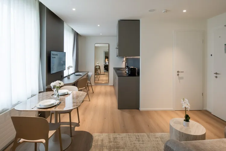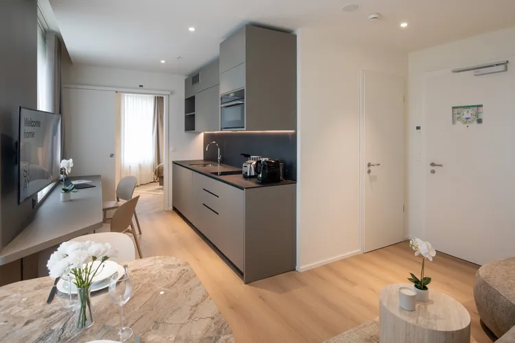 Ref: 518000 Explore 3DThis elegant 37m² one-bedroom apartment offers a refined blend of comfort and contemporary style. Thoughtfully laid out, it makes the most of every square meter, creating a spacious and harmonious living experience. Bathed in natural light from generous windows adorned with sheer curtains and blackout drapes, the apartment radiates a calm, inviting atmosphere. The living area and bedroom are furnished with sleek, minimalist pieces in a soothing palette of beige, off-white, and soft greys—enhancing the overall sense of openness and understated sophistication. The separate bedroom provides privacy and tranquility, while the modern, fully equipped kitchen invites effortless everyday living. A stylish, well-appointed bathroom with a shower, along with the added convenience of an in-unit washing machine, completes the space.